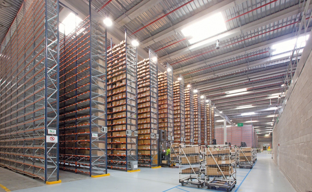 These racks are supplied from narrow aisles where high-level order pickers circulate, which are used to replenish reserve boxes and house them at higher levels. This solution provides the following benefits: