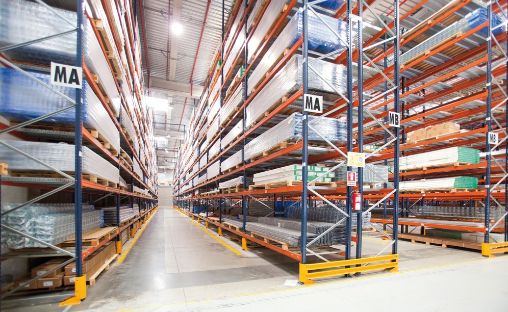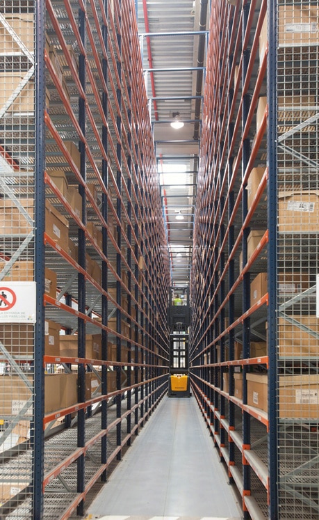 Medium-dimensioned and higher consumption products are stored in single access racks, with levels formed by perforated shelves housing different sized pallets. In this zone, trilateral lift machines are used to perform replenishment tasks, so aisles are narrower. These aisles do not interfere with the wider aisles where picking with low-level order pickers is done.