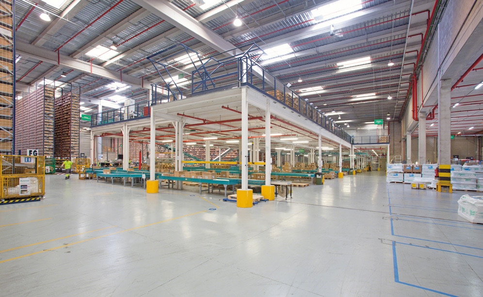 To finish the process, orders prepared in both areas are consolidated on a mezzanine located in an area next to the docks that uses roller and belt conveyors.