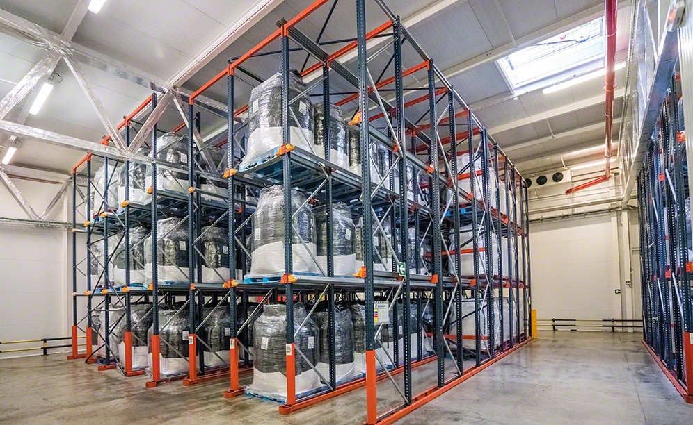 The racks comprise a pair of 6.5 m high lanes, each one with three levels for storage. Meanwhile, each level has heavy-duty galvanised steel support rails where palletised sacks are deposited.
