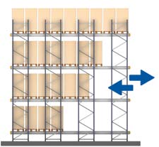 Semi-automatic compact system that uses an electric shuttle to load and unload the pallets inside shelves quickly and accurately.